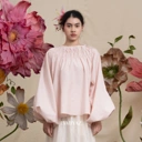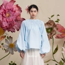 A shirred blouse with gathered detailing and wide sleeves, creating a soft, voluminous form. Light and whimsical, it brings a poetic rhythm to everyday dressing.