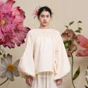 A shirred blouse with gathered detailing and wide sleeves, creating a soft, voluminous form. Light and whimsical, it brings a poetic rhythm to everyday dressing.