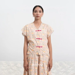 A sleeveless vest featuring a neat, structured shape and delicate scalloped edges that convey effortless charm. Detailed with Shanghai buttons for a sweet and timeless accent. Presented in Kenanga pattern, blooming with luminous florals and gentle feminine warmth.