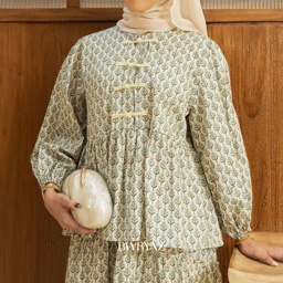 A romantic peplum blouse with softly gathered sleeves and a gently flared hem that flatters the waist while maintaining effortless ease. Accented with graceful Shanghai buttons for a dainty finishing touch. Presented in Pusparani pattern, emanating serene elegance through its soft green hues.