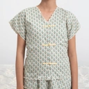 A sleeveless vest featuring a neat, structured shape and delicate scalloped edges that convey effortless charm. Detailed with Shanghai buttons for a sweet and timeless accent. Presented in Pusparani pattern, embracing calm elegance in soft green tones and rhythmic floral motifs.