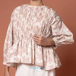 Embrace feminine elegance with the Laela Flower Shired Blouse. Featuring delicate smock details on the chest and waist, this blouse creates a unique texture while enhancing a graceful silhouette. Adorned with a beautiful rose pattern symbolizing purity and harmony.