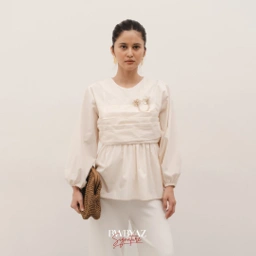The Manor Drapery Blouse features a vintage-modern style with a fitted upper silhouette and a flared lower half. Drapery details and puff sleeves add a graceful touch and create a statement look. Perfect for an elegant yet effortlessly feminine outfit.