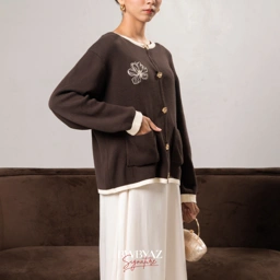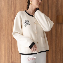 The Audrey List features floral embroidery accents and gold buttons, creating a sweet and preppy vibe. The contrasting ribbing along the edges adds a playful touch while maintaining a chic look.