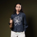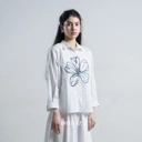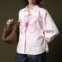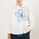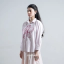 The Sasmita Blooming Shirt is a crisp cotton blouse with clean striped lines that flatter the form. A bold floral embroidery blooms along the hidden button placket, bringing unexpected charm to its minimal look. With side loops and a detachable waist tie, it can be worn loose or cinched—balancing structure and softness in one refined piece.