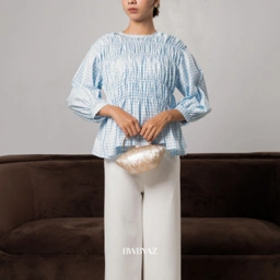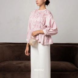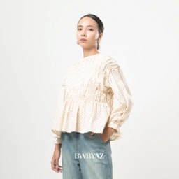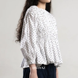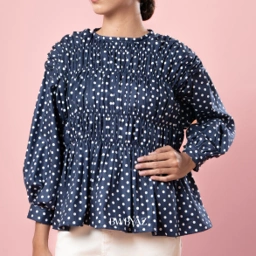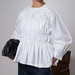 The Pamela Shirred Blouse features an all-over shirred bodice with playful polka dots, airy balloon sleeves, and a flared hem. Crafted from soft cotton, it offers a comfortable yet charming look for any occasion.