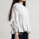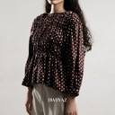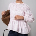 The Pamela Shirred Blouse features an all-over shirred bodice with playful polka dots, airy balloon sleeves, and a flared hem. Crafted from soft cotton, it offers a comfortable yet charming look for any occasion.