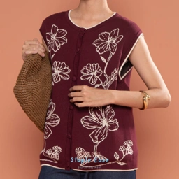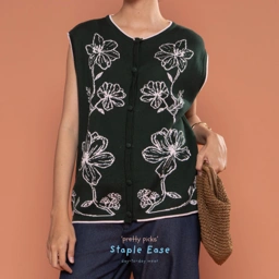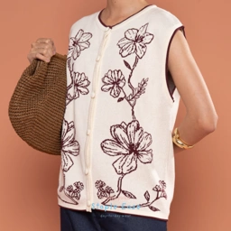 A chic color-block vest designed with a harmonious blend of tones. The front is adorned with delicate floral detailing, adding a feminine touch to this versatile layering piece