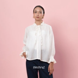 Crafted from a textured, flowy fabric that drapes beautifully with every movement. Designed with voluminous sleeves and finished with delicate ruffle detailing along the neckline, it blends feminine charm with effortless comfort.