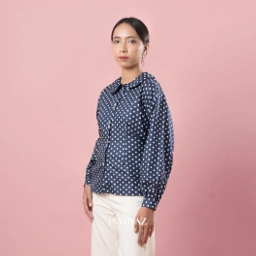 Althea Fitted Shirt. Fitted cut balanced with puff sleeves for volume. Small polka-dots add a playful yet neat visual texture.