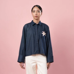 Kaia Bloomy Shirt Boxy silhouette with sharp shoulders and relaxed body fit. A small embroidery on the chest pocket breaks the plain surface with a subtle accent.