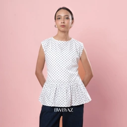 Straight body line with a flared peplum hem, giving a playful silhouette. Scattered polka-dots add lightness and cheerful energy.