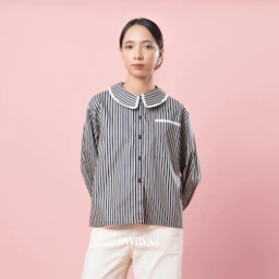 Helena Lacey Shirt Loose fit with tight vertical stripes that create a lengthening effect. A single pocket breaks the stripe pattern for a subtle contrast. Estimasi Pengiriman : 28 JANUARI 2026