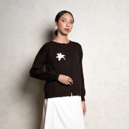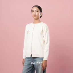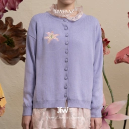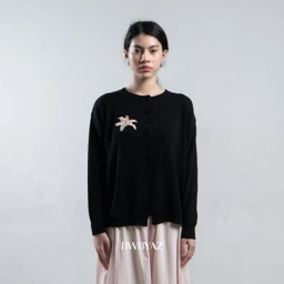 Ophelia Bloomy Knit Cardigan Loose silhouette with a gentle drape, highlighted by delicate floral embroidery that adds a feminine touch on the plain surface.