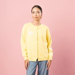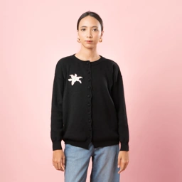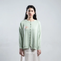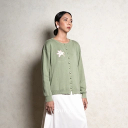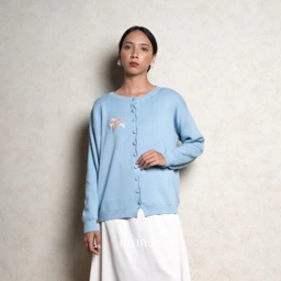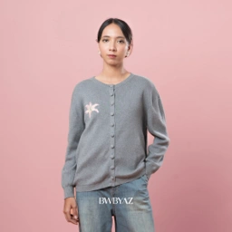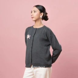 Ophelia Bloomy Knit Cardigan Loose silhouette with a gentle drape, highlighted by delicate floral embroidery that adds a feminine touch on the plain surface.