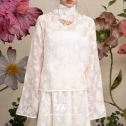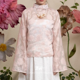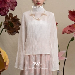 A sheer pleated blouse with a high neckline for a clean, graceful finish. The pleats add subtle movement, making it a piece that feel both classic and effortlessly modern.