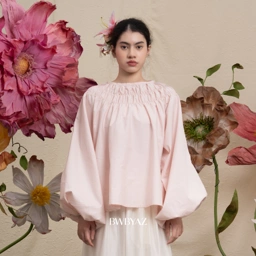 A shirred blouse with gathered detailing and wide sleeves, creating a soft, voluminous form. Light and whimsical, it brings a poetic rhythm to everyday dressing.