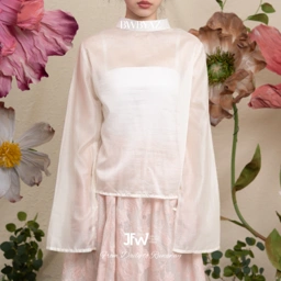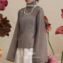 A sheer pleated blouse with a high neckline for a clean, graceful finish. The pleats add subtle movement, making it a piece that feel both classic and effortlessly modern.