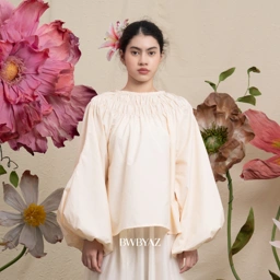 A shirred blouse with gathered detailing and wide sleeves, creating a soft, voluminous form. Light and whimsical, it brings a poetic rhythm to everyday dressing.