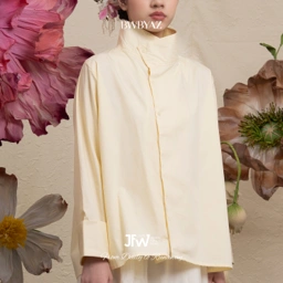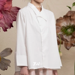 An elevated asymmetrical shirt crafted from crisp paper cotton. The structured texture gives it a modern, airy feel balancing sharp
