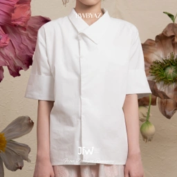An elevated asymmetrical shirt crafted from crisp paper cotton. The structured texture gives it a modern, airy feel balancing sharp