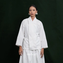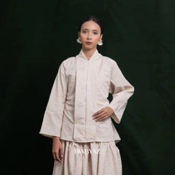 Tailored from premium embossed fabric, this kebaya radiates understated sophistication through its refined structure and textured finish. The setali neckline and front zipper offer a contemporary edge, while a slim waist tie enhances its feminine form with subtle grace.