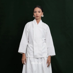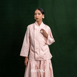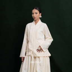 Tailored from premium embossed fabric, this kebaya radiates understated sophistication through its refined structure and textured finish. The setali neckline and front zipper offer a contemporary edge, while a slim waist tie enhances its feminine form with subtle grace.