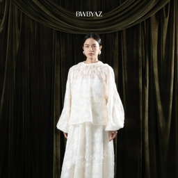 Crafted from soft premium lace, this blouse features a refined sheer finish with intricate motifs that add depth and texture. Defined by a clean, timeless silhouette, it is detailed with two soft gathers at the shoulders for subtle shaping, complemented by puffed sleeves with elastic cuffs that provide gentle volume and ease.