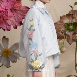 A cropped puffy jacket with floral embroidery on the sleeves. Playful yet refined, it combines a youthful silhouette with the softness of handcrafted details.