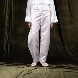 Crafted in classic gloss satin, these barrel pants feature a structured silhouette and a sleek, glossy finish. Designed for a polished, modern look, they are perfect for layering or making a statement on their own.