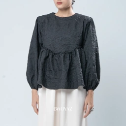 A blouse with peplum-style cut that gently defines the waist, while the flared hem creates a graceful, flowing silhouette. Ruffle details accentuate the seam lines, adding movement and a romantic touch. This blouse blends elegance and comfort, making it suitable for both everyday wear and special occasions.