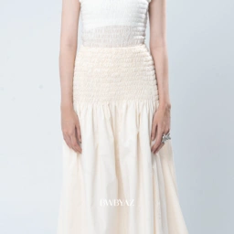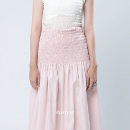 A long skirt designed with elastic smocking at the hip area, creating a comfortable and flattering fit. The smocked detail adds subtle texture while allowing flexibility and ease of movement. Flowing into a graceful long silhouette, this skirt offers an effortless balance of comfort and elegance, making it suitable for everyday wear as well as more refined occasions.