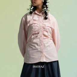 A shirt featuring gathered detailing at the bust, adding soft texture and a feminine silhouette. Designed with long sleeves finished with oversized cuffs for a bold yet elegant touch. An adjustable tie at the waist allows the fit to be customized, gently defining the shape while maintaining comfort. This piece blends structure and softness, making it suitable for both polished everyday looks and elevated occasions.