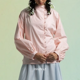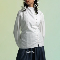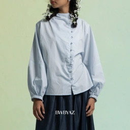 A shirt featuring buttons inspired by morning dew, adding a subtle, luminous accent to the design. The front design allows for two styling options, offering versatility when worn open or styled differently. Finished with puff sleeves detailed with a gentle slit near the cuffs, allowing ease of movement. Designed with a connected collar that sits slightly higher on the neck, this piece presents a refined and elegant silhouette suitable for both professional and elevated everyday wear.