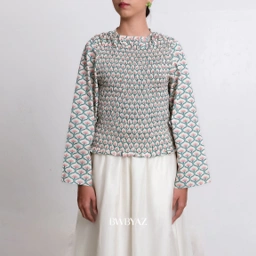 A top featuring full elastic smocking across the bodice, creating a flexible and body-hugging fit. Designed with flared sleeves that add movement and a soft feminine touch, this piece offers both comfort and visual interest. The balanced silhouette makes it an easy choice for everyday wear while still feeling elevated and stylish.